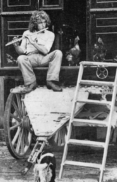 Podle jedněch historických pramenů je na následující fotografii zachycen čeledín Václav Veverka (prasynovec bratranců Veverkových Václava a Františka a praprastrýc Bilba Veverky) ve chvíli, když si zrovna přehrává starý prastrýcův repertoár o přestávce mezi rutinními pracemi během perných žní roku 1904. Podle pramenů jiných, a zdůrazňujeme, že neméně důvěryhodných, se ale jedná o jistého Rogera Daltreye, zachyceného v okamžiku, kdy se na Andersonově farmě v létě roku 1967 zúčastňuje konkurzu na místo druhého flétnisty do tehdy téměř neznámé kapely Candy Coloured Rain, která se na jeho popud později přejmenovala (na v té době ještě méně známé) Jethro Tull. (1904 nebo 1967) |
